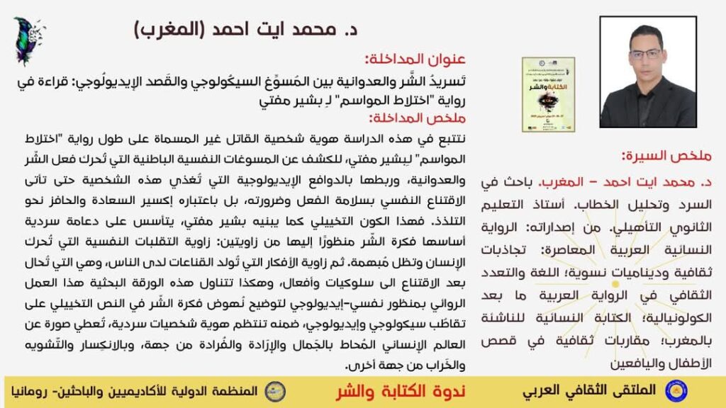 مشاركة – الكتابة والشر Post last modified:سبتمبر 10, 2025 MOHAMED AIT AHMED د. محمد ايت احمد - أستاذ باحث You Might Also Like ترجمتنا عن الانجليزية لجون بيري: مسرحة وأفلمة الرواية، الاقتباس والتحويل والتكييف. سبتمبر 9, 2025 التلقي العربي للسيميائيات الثقافية تأليفًا وترجمة – عبد المجيد النوسي مثالًا. سبتمبر 9, 2025 دراسة: تقويض الطابو الذكوري، استراتيجيات الانتهاك في رواية التشهي لعالية ممدوح سبتمبر 9, 2025
